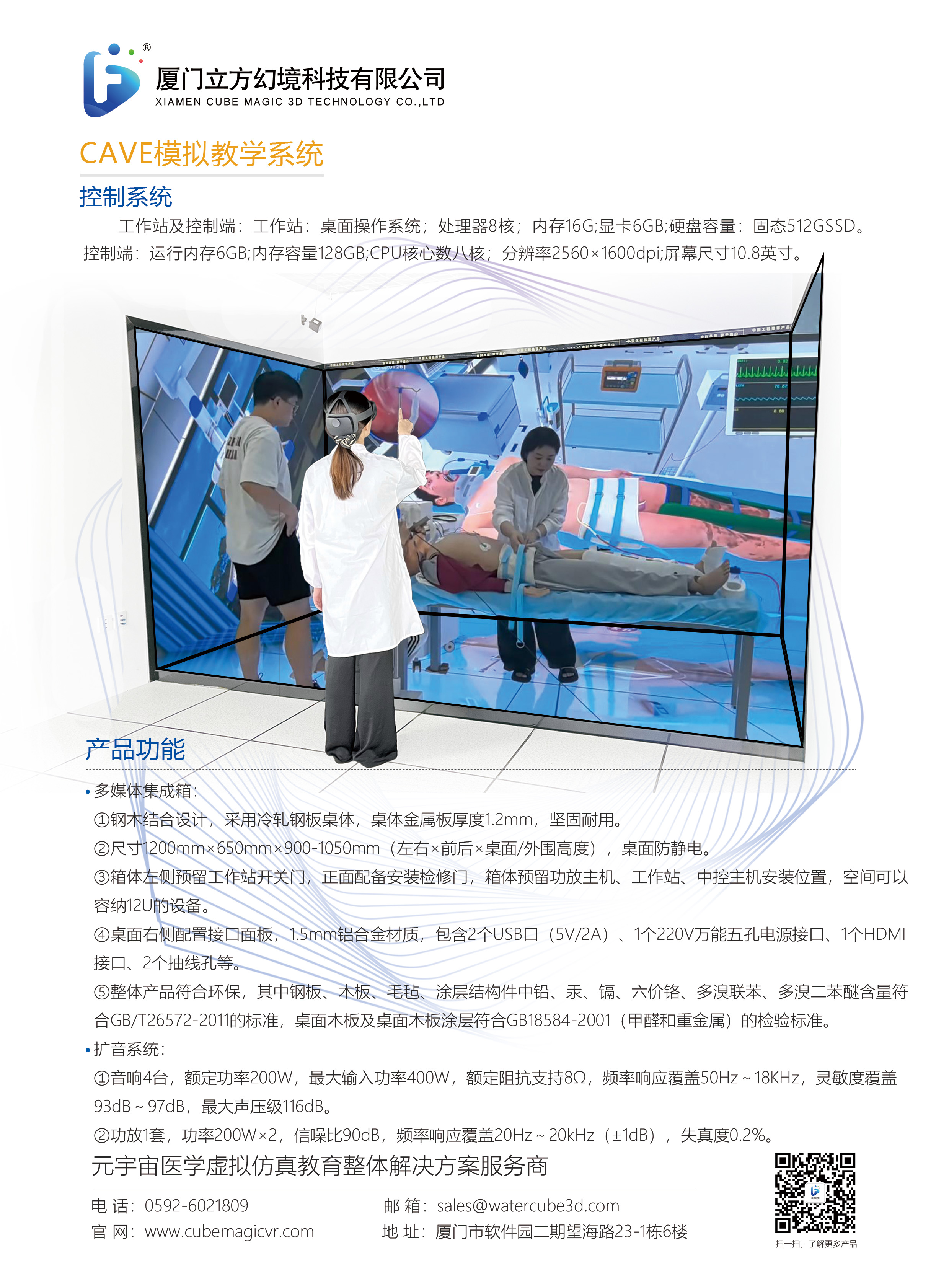 CAVE 互动大屏是一款高性能 3D 显示互动设备,由正面屏与左右侧屏组成,显示面积≥28m?,采用 P2 高刷全彩屏设计。设备像素点间距≤2.0mm,像素密度≥250000Dots/m?,搭配≥3840Hz 高刷新率与 9000:1 高对比度,呈现清晰细腻的 3D 视觉效果。它具备动态节能与智能息屏功能,节能效率超 50%,且支持掉电存储,保障数据安全,符合 GB4943.1-2022 安全标准。配套控制卡、控制器可实现高带载与色温调节,工作 站、控制端等硬件配置强劲,搭配冷轧钢板材质的多媒体集成箱及专业扩音系统,兼具稳定性与实用性,适用于多种互动展示场景。